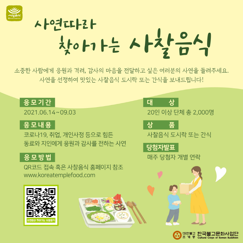 사연을 선정하여 건강하고 맛있는 사찰음식(도시락 또는 간식)을 보내드립니다!